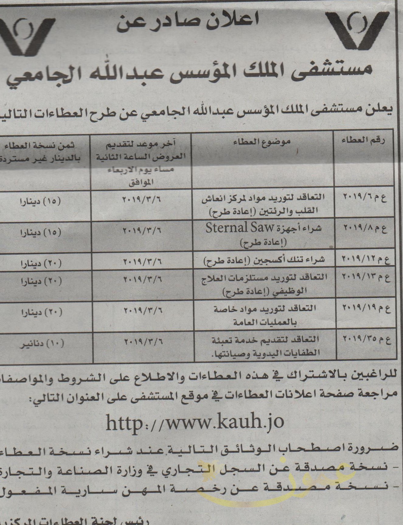 عطاءات صادرة عن مستشفى المللك المؤسس عبدالله الجامعي عطاءات وكالة